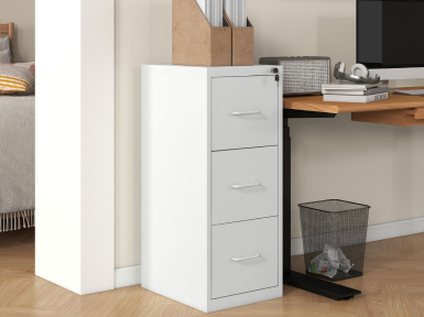 A sleek black desk, paired with a white chair and modern storage, creates a clutter-free, functional space. Neatly organized files and minimalist decor provide a calm, productive environment.