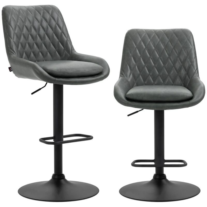 HOMCOM Retro Bar Stools Set of 2, Adjustable Kitchen Stool, Upholstered Bar Chairs with Back, Swivel Seat, Dark Grey