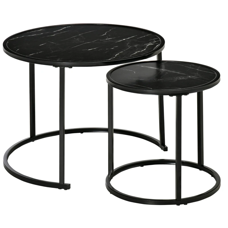 HOMCOM Set of 2 Round Nesting Stackable Coffee Tables, Marble-Effect Wooden Top and Metal Legs, Black