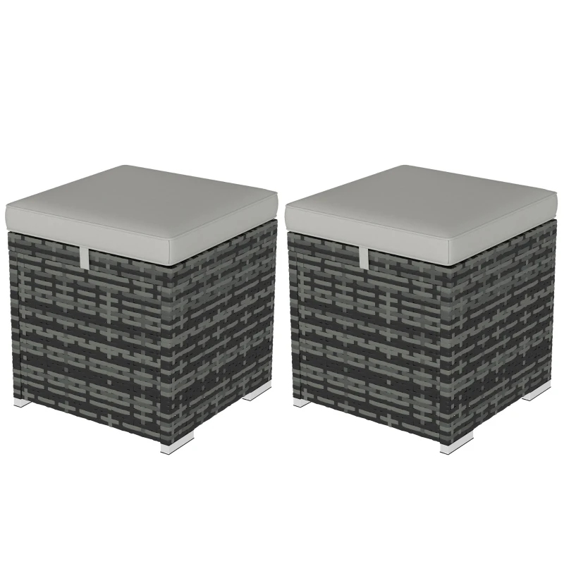 Outsunny Set of 2 PE Rattan Stools with Storage Garden Footrest with Cushion 40 x 40 x 41 cm, Light Gray(m-2)